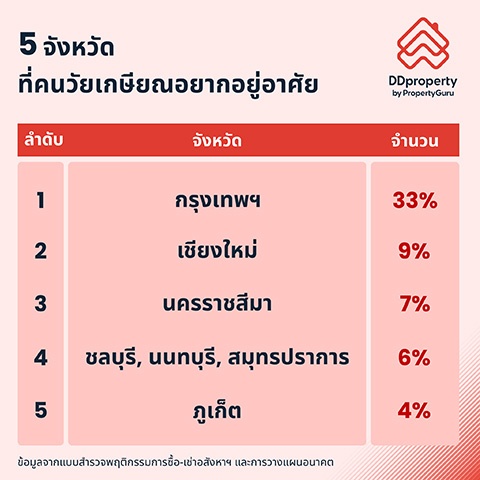 สำหรับเมืองที่ผู้บริโภคต้องการไปใช้ชีวิตหลังเกษียณมากที่สุด ได้แก่ กรุงเทพมหานคร (33%) ด้วยจุดเด่นของการเป็นเมืองหลวงที่มีความพร้อมรอบด้าน ทั้งระบบสาธารณูปโภคที่ครบครัน ตลอดจนสถานพยาบาลที่มีมาตรฐานและมีเทคโนโลยีทางการแพทย์ที่ทันสมัย จึงสามารถรองรับการดูแลสุขภาพในระยะยาวได้อย่างมั่นใจ รองลงมาคือ เชียงใหม่ (9%), นครราชสีมา (7%), ชลบุรี นนทบุรี สมุทรปราการ (สัดส่วนเท่ากันที่ 6%) และภูเก็ต (4%) ขณะที่อีก 11% เผยว่าไม่มีทำเลไหนที่สนใจเป็นพิเศษ ขอแค่อยู่ในประเทศไทยก็พอ