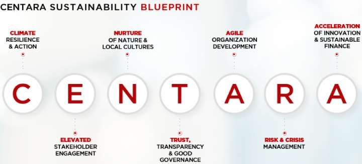 และเพื่อเป็นการตอกย้ำในเรื่องของวิสัยทัศน์ กลยุทธ์ และเป้าหมายด้าน ESG ของบริษัท เซ็นทารายังได้ประกาศกลยุทธ์ด้านความยั่งยืนภายใต้ชื่อ C-E-N-T-A-R-A Sustainability Blueprint ซึ่งถือเป็นหัวใจสำคัญของการดำเนินธุรกิจของเซ็นทารา เพื่อใช้ในการกำหนดทิศทางและพัฒนาหลักปฏิบัติงานด้านสิ่งแวดล้อมขององค์กรในระยะยาวโดยกลยุทธ์นี้ แยกออกเป็น 7 หัวข้อ อันได้แก่