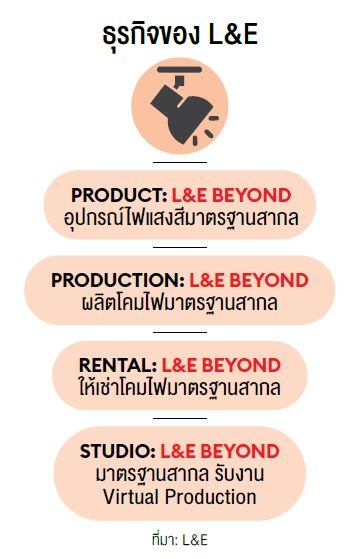 L&E Beyond สร้างแบรนด์มาประมาณ 2 ปี เป็นผู้นำผลิตภัณฑ์โซลูชันแสงสว่างทั้งในไทยและอาเซียน เป็นธุรกิจที่ต่อยอดจากจุดแข็งของ L&E สร้างเป็นมิชชัน อยากให้คนที่ทำงานในประเทศนี้และคนที่อยู่ในธุรกิจบันเทิงมีการวางแผนก่อนผลิตแบบพรีโปรดักชั่นจริงๆ ซึ่ง L&E มีฟีเจอร์เพียงพอสำหรับการใช้งานในไทยอย่างมีมาตรฐานและปลอดภัย ด้วยศักยภาพโรงงานผลิตประกอบหรือออกแบบเกี่ยวกับไลท์ติ้งเพื่อต่อยอดธุรกิจของบริษัทให้สามารถทำสิ่งเหล่านี้ได้ เพราะไฟสำหรับเวทีมีความซับซ้อนกว่าไฟทั่วไป เปลี่ยนสี ปรับแสง การควบคุมทุกการเคลื่อนไหว เป็นความท้าทายอีกอย่างในการผลิตเพื่อให้ตอบโจทย์ได้